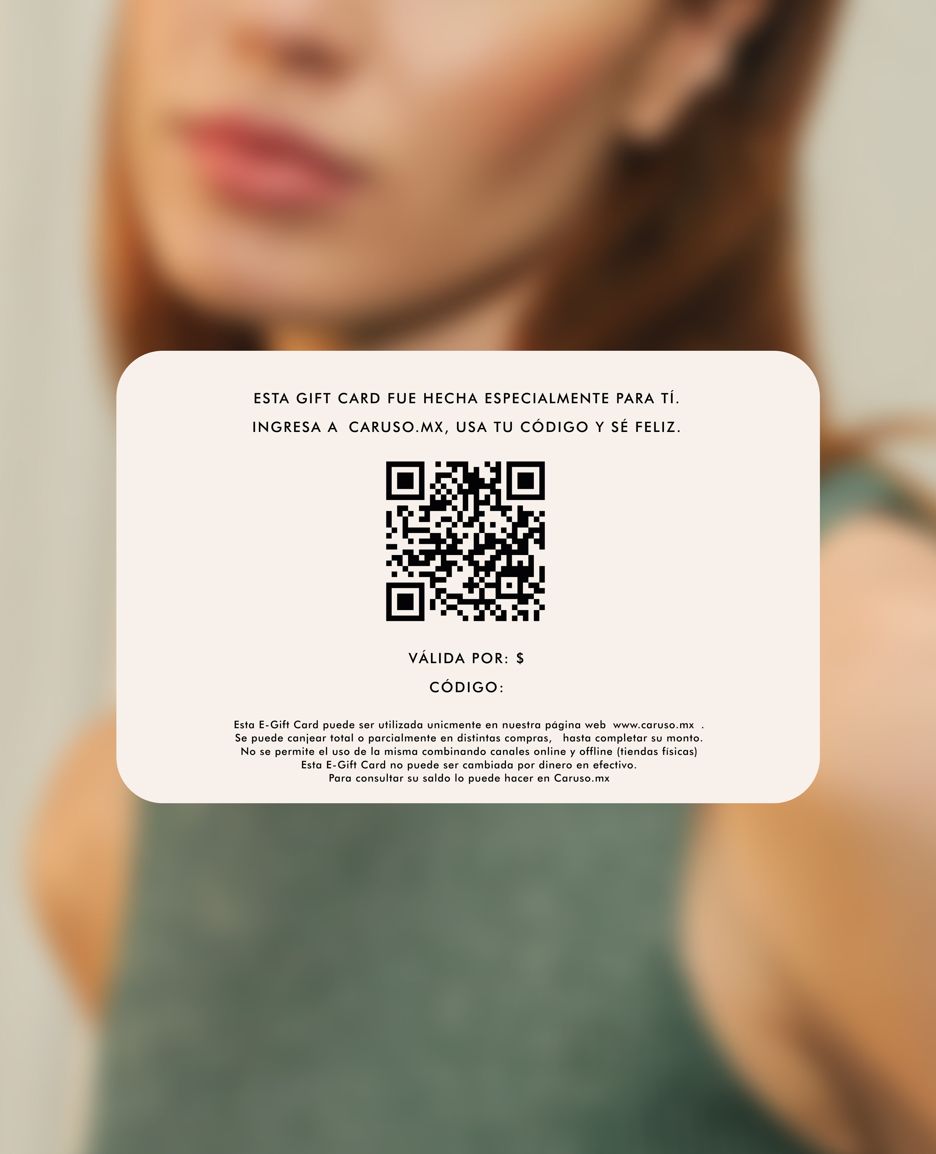 Esta E-Gift Card puede ser utilizada unicmente en nuestra página web www.caruso.mx . Se puede canjear total o parcialmente en distintas compras, hasta completar su monto.
