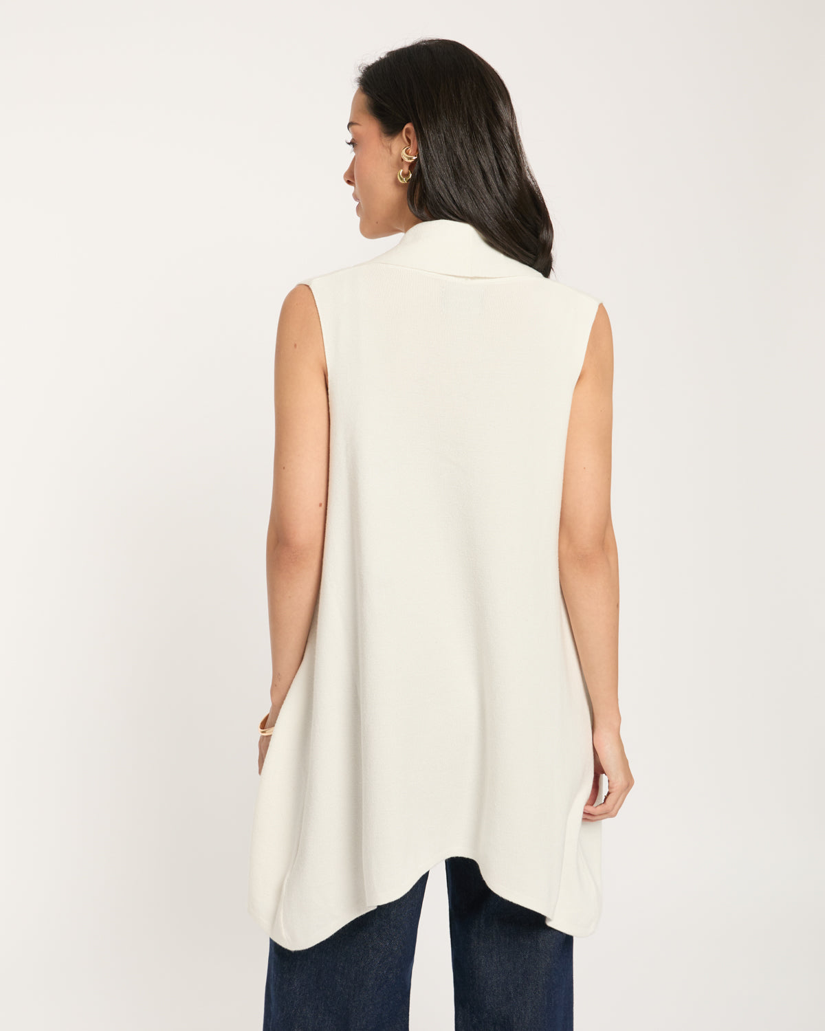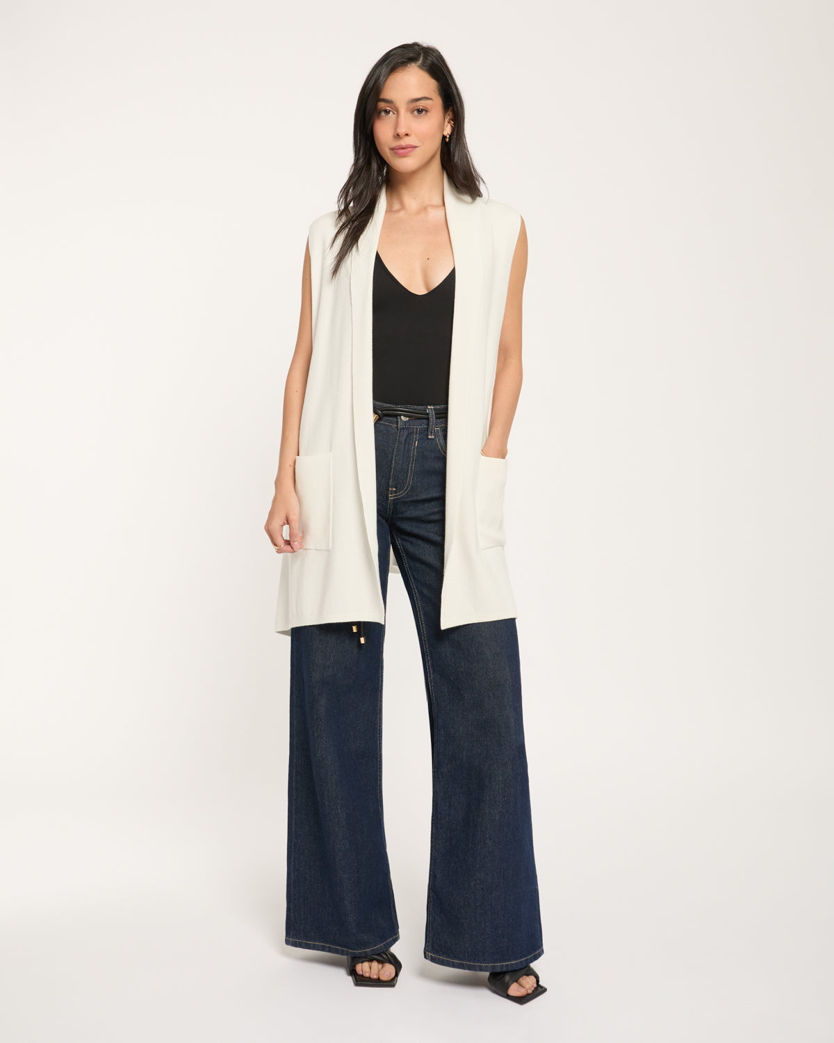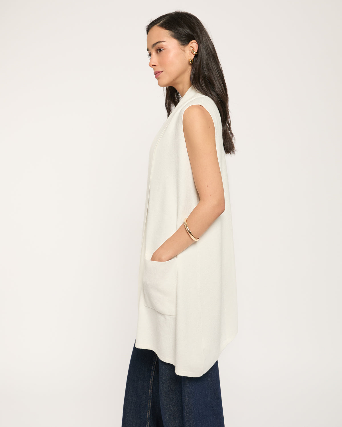 Chaleco largo de punto fino, 2 bolsas y cuello con solapa.